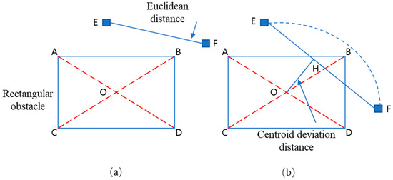 The analysis of factors influencing the distance impacted by common obstacles on a deck involves extracting characteristic data for regression analysis. Key characteristic data comprise the Euclidean distance, obstacle area, centroid deviation distance, and obstacle shape. The Euclidean distance denotes the direct distance between two positional points, while the centroid deviation distance indicates the distance between the line connecting two positional points and the obstacle material’s center. In the illustration in Figure 3, ABCD represents a rectangular obstacle, and EF represents two cabins. In the absence of obstacles between the two target points, the distance is the Euclidean distance. However, when obstacles are present between the two target points, the actual route follows the dotted line EF, with OH representing the centroid deviation distance.