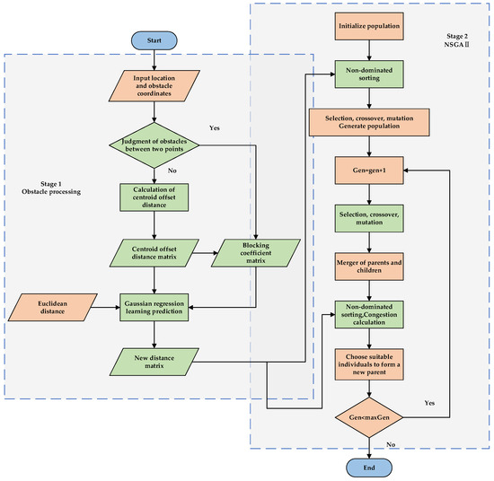 The enhanced HO-NSGAII algorithm efficiently identifies the presence of obstacles between two designated points by analyzing the coordinates of each position point on the map, the coordinates of the obstacle material center, and the obstacle’s area. Additionally, it promptly estimates the actual distance by leveraging the findings presented in Section 3. This addresses the limitations of the initial algorithm in real-world scenarios. The flow of the hybrid algorithm is shown in Figure 5.
