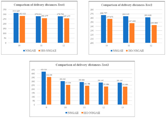 The NSGAII algorithm calculates the distribution distance based on the location coordinates, resulting in the straight-line distance between two location points. When obstacles are present between two points, the actual distribution route deviates from a straight line, leading to a longer distribution distance compared to the straight-line distance. Therefore, when comparing solutions, it is necessary to first modify the solutions obtained by the NSGAII algorithm. As shown in Table 5, D1 represents the delivery distance of the initial solution, and D2 is the modified distance after considering the impact of obstacles. In contrast, the HO-NSGAII algorithm accounts for obstacle distances, eliminating the need for distance modification (D3 = D4). The specific comparison results are presented in Table 5 and Figure 7, demonstrating superior calculation outcomes for the HO-NSGAII algorithm. In Table 5, m represents the number of vehicles, D1 and D3 represent the delivery distance before correction, while D2 and D4 represent the distance after correction. The distance gap is calculated as D2–D4, and the optimization rate is expressed as the distance gap divided by D2.