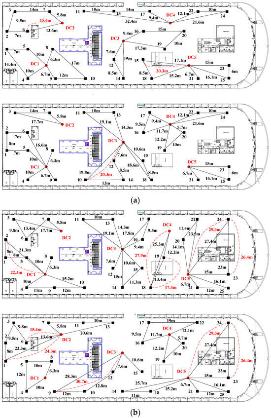 Taking one set of data as an example, the actual calculation results are as follows: Figure 8 shows the distribution routes for two types of decentralized solutions (the red dashed line in the figure represents the revised actual route).