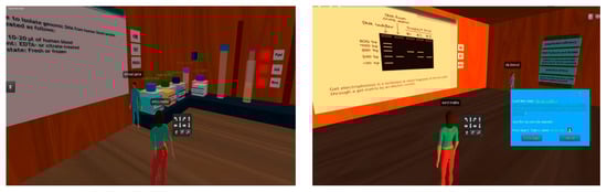 In the context of Palestine, teaching and learning molecular biology face obstacles such as the lack of DNA analysis labs in most universities, the high costs associated with equipping molecular biology laboratories, and the real potential risks of students’ presence in the laboratories. In addition, the COVID-19 pandemic forced institutions towards online education. The COVID-19 pandemic has led to significant changes in the delivery of education globally, with online engagement and accelerated uptake of novel teaching and assessment modalities into majority practice within institutions []. Furthermore, the special geopolitical circumstances in Palestine and restrictions imposed by the limited mobility between Palestinian cities. To meet all these challenges, realistic scenarios in VR were incorporated into the biology curriculum by creating scenarios that simulate DNA analysis in a virtual learning environment.