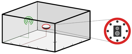 In the simulations (code available at https://github.com/VCurtarelli/py-ssb-ctf-bf (accessed on 21 August 2024)), we employed room impulse responses that were generated using the RIR generator [29] and signals that were selected from the SMARD database [30]. In all cases, we used LD = LY and ; with this, we disregarded any non-causal frames and considered as many frame samples as the RIR samples. The room’s dimensions were (width × length × height), with a reverberation time of . The device composed of the loudspeaker plus sensors was centered at , comprising sensors arranged in a circular array with a radius of . All sensors were omnidirectional with a flat frequency response, with the reference being the sensor at . The positions and signals used for the sources are shown in Table 1. The room’s layout is described in Figure 1, where in green we have the desired source (assumed to be omnidirectional), and in red the device, with the 8 sensors and the loudspeaker in the center.