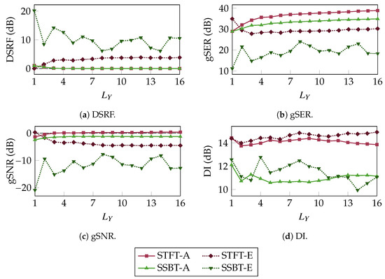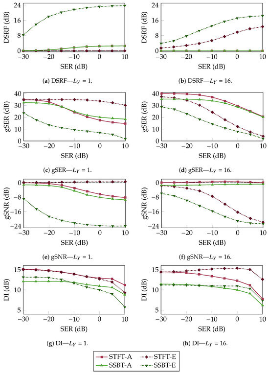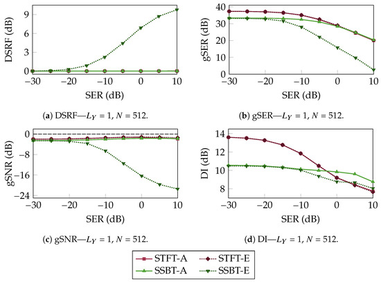 The compared filters aim to reduce the loudspeaker’s signal while preserving the desired signal. The minimal enhancement for white noise is also interesting, given the regularization parameter added to the problem. These are measured by the desired signal reduction factor (DSRF, or ξx), gain in SER (gSER), and gain in SNR (gSNR), respectively. We also observe the directivity index (DI, or ), which measures the beamformer’s behavior when employed in a spherically anisotropic noise field. Their time-dependent broadband formulations are given by