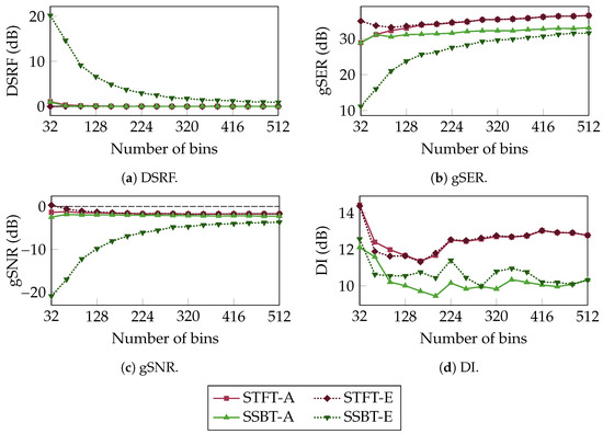 Observing strictly the mathematical structures of Equation (8) and Equation (11), the FT can be treated as a particular case of the RFT formulation, where , and . Knowing this, we use the SSBT formulation of Equation (26) for both the SSBT and the STFT, as it is a more general model. The necessary considerations are taken when particularizing the equations for the STFT.