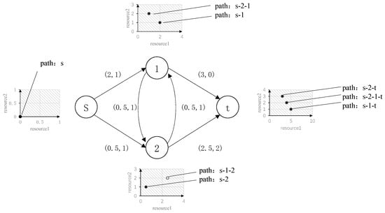 A constrained shortest path example based on two resources is shown in Figure 2. Starting from the starting point S, there are two labels, s-2-1 and s-1 at node 1, and the resource vectors are (1,2) and (2,1), respectively, and there is no dominance relationship; at node 2, there are two labels, s-1-2 and s-2, and the resource vectors are (2.5,2) and (0.5,1), respectively, and the former is dominated by the latter. Therefore, the path s-1-2 is abandoned and no longer expanded. Finally, at node t, there are three labels, s-2-t, s-2-1-t, and s-1-t, and the resource vectors are (3,3), (4,2), and (5,1), respectively, and there is no dominant relationship between them. Therefore, all three paths are Pareto optimal solutions.