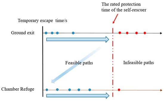 The above algorithm yields a Pareto optimal set, in which any path is not dominant in terms of the two attributes of equivalent length and time spent walking in the smoke relative to other paths. In order to achieve real-time path-assisted decision making, it is also necessary to consider parameters such as the choice of disaster escape exits and the time to escape the disaster area. The target of the escape exit is to prioritize surface exits such as the auxiliary shaft and the main shaft. When no solution can be found for all surface exits, the refuge chamber is used as the escape exit.