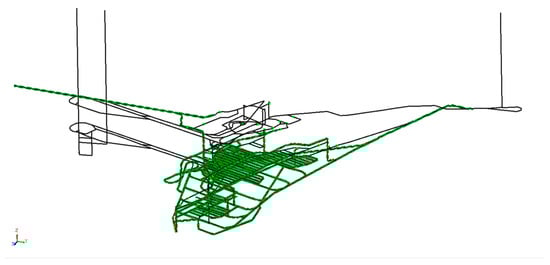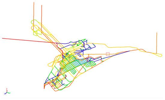 The ventilation network of an iron ore mine is modeled as an example. The ventilation network graph of this mine has 494 nodes and 660 edges. The ventilation method is forced ventilation, with air entering through the west shaft and returning through the east return shaft as well as the main and auxiliary shafts. Workers can escape to the surface through the main and secondary shafts, inclined shafts, and the intake shaft. All draw raises, return air shafts, etc., are made impassable. One refuge is located at Level −330 and one at Level −175. These chambers will allow workers to escape to the surface if they are unable to do so. The mine ventilation system for the mine is shown in Figure 5 and Figure 6: