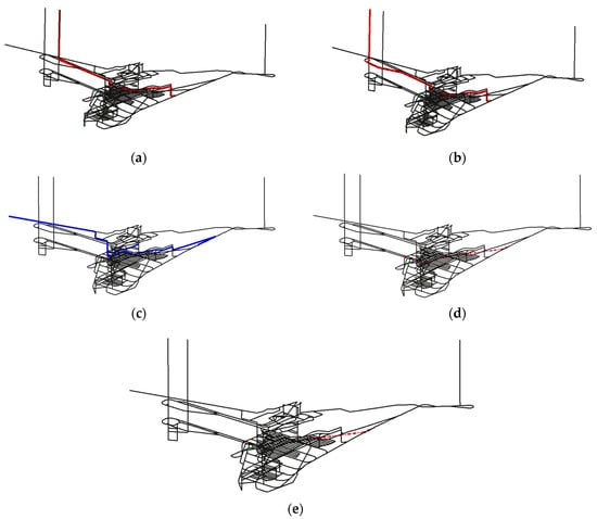 Evacuation routes to different destinations. (a) Route to the main shaft. (b) Route to the auxiliary shaft. (c) Route to the incline shaft. (d) Route to the chamber refuge1. (e) Route to the chamber refuge2.