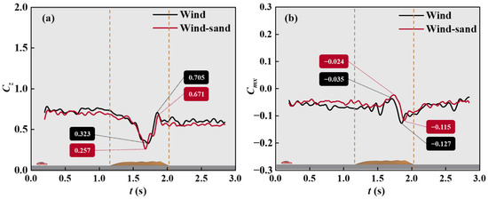 - The comparison of the wind and wind–sand cases shows that the fluctuation differences in the lateral force, the rolling moment, and the yaw moment are 8.4%, 1.1%, and 14.2%, respectively.