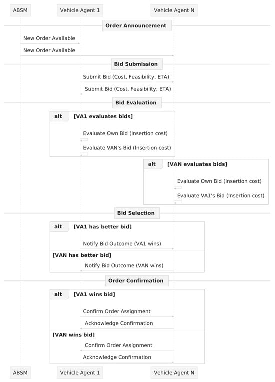 The consensus mechanism is built as a negotiation-based process as depicted in Figure 4. The negotiation occurs between all Vehicle Agents when a new pickup and delivery orders pair is generated. Next, the pickup and delivery orders are submitted to all the vehicle agents. Subsequently, each vehicle agent evaluates its cost based on the constraints defined by the model in Section 3 and generates a bid value as the total distance traveled by the vehicle (Equation (1)), considering the new orders. The best bid value is then used to allocate the pickup and delivery orders to a vehicle agent. The whole process is described by Algorithm 1.