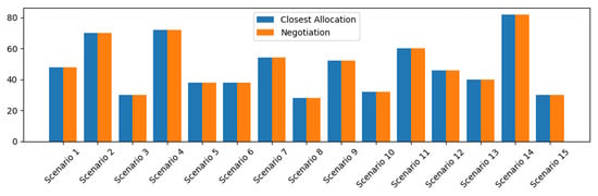 Total distance traveled: This metric shows the total distance traveled by all vehicles. As depicted in Figure 8, where the x-axis represents the scenarios labeled “Scenario 1” to “Scenario 15” and the y-axis represents the distance traveled, in some scenarios, the results show longer distances for the “Closest Allocation”, while in others, they show longer distances for “Negotiation”. Although this metric may show that the vehicles traveled a longer distance, it needs to be looked at along with the above-mentioned metrics for order handling.
