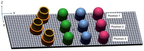 To achieve the objective of fabricating reference elements for 3D optical scanners, it is necessary to have some type of support that can be attached (usually by gluing) to the bottom of the spheres for securing them. Additionally, it is essential that the spheres have a well-defined diameter. Therefore, the solution involves manufacturing “extended hemispheres”, producing these elements from the pole to a “safety zone” below the equator, or vice versa (depending on the additive process strategy). Thus, starting from the CAD model of this extended hemisphere, different geometries of the master pattern have been designed, considering the manufacturer’s recommendations, as well as the limitations of the additive manufacturing process (SLA), mainly in the stages following printing (post-processing of the green part). According to the manufacturer’s recommendations, the maximum wall thicknesses should not exceed 5 mm, since deformations and cracks could appear during the removal of organics in the debinding stage. For this reason, and due to the search for lightweight structures that can be deployed as high and mid-range calibration and qualification standards, two wall thicknesses were used in the designed artifacts. As mentioned, the design of manufacturing’ supports are a crucial part of the design process, to avoid layer displacements during printing []. Different types of “set-up printing configurations” were considered. Figure 2 shows a 3D design of the layout of the test spheres on the printing tray. The colors represent different configurations of manufactured spheres which will be explained below (Section 3).