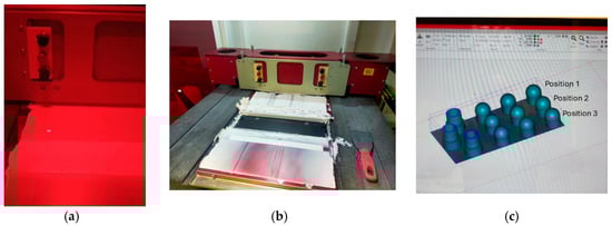 AM printer: (a) during the printing and light-curing process. (b) Printing tray after removal of the parts. (c) Spheres’ layout on the AM machine display.