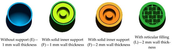 - Interior structure (IS), with three options: without internal support (E), with internal support (F), and with a lattice-type infill (L), see Figure 4. In the case of the solid support without contact, the gap part/support was 0.3 mm.
