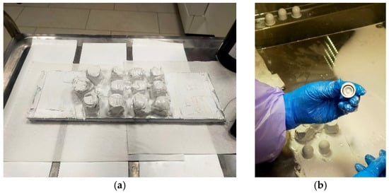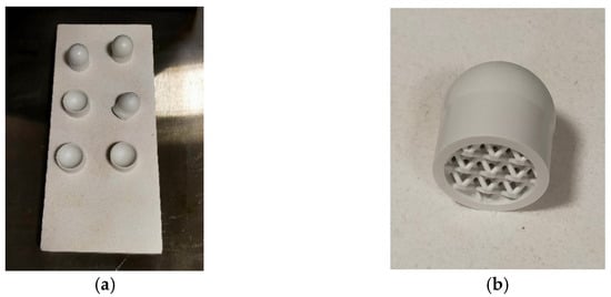 As previously mentioned, the printing process was carried out using Vat Photopolymerization by Ultraviolet Laser for Ceramics (VPP-UVL/C) in two series, each lasting approximately 18 h, using 3DMIX ALUMINA AL-F02 alumina paste supplied by the printer’s provider (3DCeram, Bonnac-la-Côte, France). This phase of the additive manufacturing process is the most sensitive regarding the potential to damage the pieces during handling, as the pieces do not yet have their final mechanical properties. In fact, once the print bed is removed from the printer, the pieces are not in sight (Figure 7a) as they are covered by the uncured ceramic paste, making their handling even more difficult. Cleaning to remove all traces of ceramic paste is meticulously carried out under an extraction hood (Figure 7b) to prevent the operator from inhaling gases emitted by the cleaning solution recommended by the manufacturer. This phase took 8 h, performed by a technician with specific training.