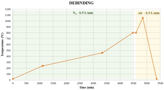 In total, almost 4 days were required to complete this stage of the process, during which the thermal treatment was conducted in a nitrogen environment to achieve a smoother surface and higher density of the final pieces. Additionally, nitrogen was used to prevent porosity formation, thereby ensuring the quality and durability of the pieces. Figure 8 shows the debinding process with a time–temperature graph according to the parameters provided by the supplier of the raw material. This graph illustrates the different thermal stages, including the final heating to a maximum temperature of 1050 °C and subsequent cooling in an air environment.