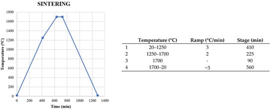 The next phase in the artifact production process was debinding. This is a key step in the manufacturing process that consists of removing organics to leave only the ceramic matrix. The ceramic paste has a high binder content (40–60%) that must be eliminated by burning at high temperatures. During this stage, the resins are removed through a combination of evaporation of low molecular weight polymers, oxidative decomposition, and thermal degradation. The organic matrix burns off at temperatures up to 550 °C. In the initial phase, the diluent evaporates. As it does so, it creates open porosity within the green piece. This facilitates the diffusion and evaporation of the polymeric components that are subsequently pyrolyzed []. Table 3 shows the stages of the debinding process. Up to 800 °C it takes place with a constant nitrogen flow of 0.5 L/min. When 800 °C is reached, the progressive change from nitrogen to air is made. From 800 °C to the end of the process, it is carried out with a constant air flow of 0.5 L/min.