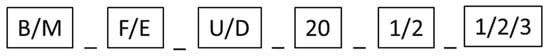 For the 18 spheres that were measured and analyzed, a nomenclature (Figure 10) was necessary to identify them according to their shape (B—bullet, M—mushroom), infill (ultimately only two types: F—with internal support, E—without internal support), orientation (U—pole up, D—pole down), diameter in mm (20), wall thickness WT in mm (1, 2), and position on the tray (1, 2, 3).