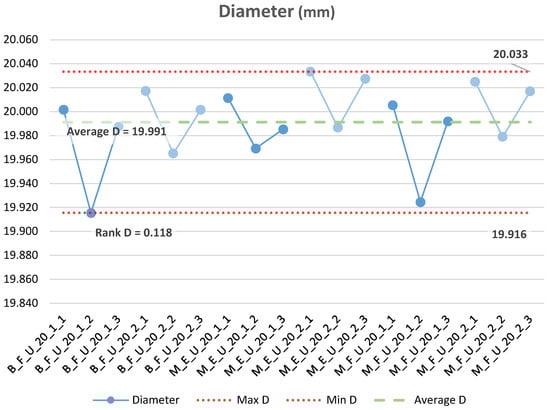 The results for the diameter values (Table 4) of the different spheres measured by contact with the CMM ranged from 20.033 mm, measured on the sphere M_E_U_20_2_1 (artifact with mushroom geometry, without internal support, oriented upwards, Ø20 mm, 2 mm wall thickness, in position 1 on the tray), to 19.916 mm, obtained on the sphere B_F_U_20_1_2 (artifact with bullet geometry, with internal support, oriented upwards, Ø20 mm, 1 mm wall thickness, in position 2 on the tray). Thus, the diameter range was 117 µm, with the average diameter of all spheres being only 9 µm below the nominal value (Figure 11).