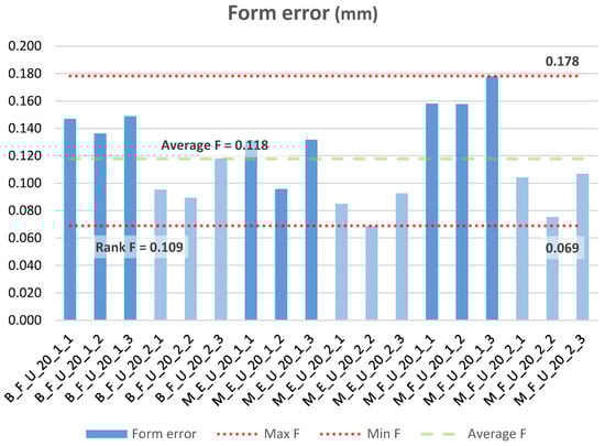 Regarding geometric quality, the data obtained for the form error (Table 5) shows a behavior similar to that of the diameter. The intermediate position (position 2) records, for all artifacts, the smallest value among the three measured for each type of artifact (the same V-shaped distribution). In this case, the smallest value, 69 µm, was obtained for the artifact M_E_U_20_2_2 (artifact with mushroom geometry, without internal support, oriented upwards, Ø20 mm, 2 mm wall thickness, and in position 2 on the tray), while the largest form error, 178 µm, was recorded for the artifact M_F_U_20_1_3 (artifact with mushroom geometry, with internal support, oriented upwards, Ø20 mm, 2 mm wall thickness, and in position 1 on the tray). In this case, the range of form error measurements is 109 µm, while the average value of all form errors measured by contact is also slightly above one-tenth of a millimeter, 118 µm (Figure 12).