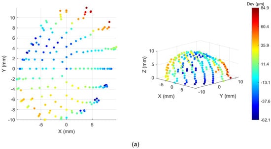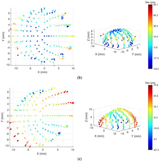 Additionally, analyzing the residuals obtained from the point clouds captured by contact with the SP25M (Renishaw, Gloucestershire, UK) on the 18 available spheres, it can be noted that all of them exhibit some ovalization error in the horizontal plane (OXY) and some flattening in the vertical direction (Z) across all possible combinations of design variables and positions. As an example, Figure 13 shows the magnified residuals of three evaluated artifacts.