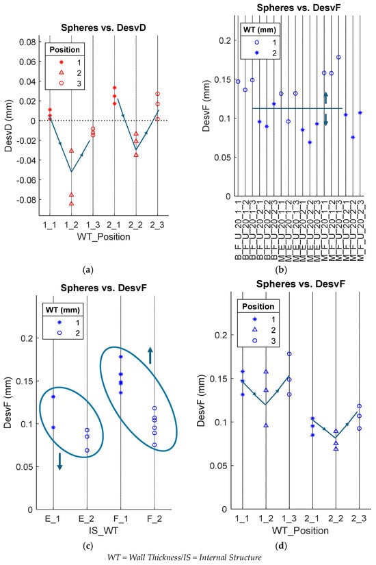 Based on the above observations, it was decided to analyze the influence of process parameters on the quality indicators of the spheres, i.e., to determine whether using a sphere with different shape, infill, thickness, orientation, or position on the printing tray could yield a geometry closer to the nominal (with less diameter deviation and/or less form error). Ultimately, this analysis aimed to identify if a specific combination of design parameters could achieve a sphere with less deformation. The following correlations between design parameters and deviations (DesvD or DesvF) are highlighted from this analysis: