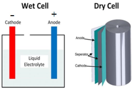 - Muelaner, J. Dry Cell vs Wet Cell Batteries. Battery Power Tips. 6 October 2021. Available online: https://www.batterypowertips.com/dry-cell-vs-wet-cell-batteries-faq/ (accessed on 19 August 2024).