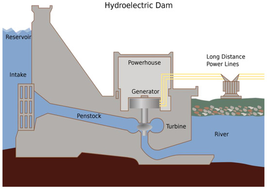 Large-scale hydroelectric installations like the Itaipu Dam in Brazil and the Three Gorges Dam in China are strategically positioned along rivers, serving as pivotal infrastructure for water storage, flood control, and electricity generation [42]. These structures, as shown in Figure 9, harness the gravitational potential energy of accumulated water, ensuring a steady supply of power to meet consumer needs. However, the construction of dams inevitably alters the surrounding environment, disrupting river ecosystems and presenting challenges for aquatic organisms [42]. The effective management of existing dams must, therefore, navigate the delicate balance between their benefits and environmental impacts. Hydroelectric power generation relies on specialized turbines to convert the kinetic energy of flowing water into mechanical rotation, facilitating electricity production [41]. Turbines, such as Pelton, Francis, Turgo, and Kaplan, are deployed based on site-specific conditions and energy requirements, with ongoing technological advancements aimed at enhancing efficiency and minimizing ecological disturbances [41]. Tailoring turbine selection to factors, like water head, flow rate, and desired power output, underscores the importance of a customized approach in turbine design and deployment.