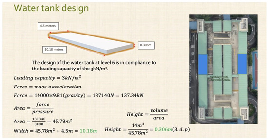 Conducting a comprehensive Life Cycle Analysis (LCA) of pumped hydroelectric storage (PHES) entails an exhaustive examination of the environmental impacts associated with the entire operational life cycle of a pumped storage facility, as outlined by the International Renewable Energy Agency (2019) [32]. This entails assessing the environmental footprint encompassing infrastructure construction, ongoing maintenance and operation, and eventual decommissioning or repurposing. Initial environmental impacts are influenced by resource extraction and processing for reservoir construction, as well as the production and transportation of turbines and generators. The LCA also accounts for the continuous operation of the facility, including energy inputs for pumping water to the upper reservoir and generating electricity during peak demand periods. Moreover, end-of-life considerations involve decommissioning and potential site repurposing, adding another layer to the sustainability evaluation. While the construction phase may pose notable environmental impacts, LCA reveals that PHES offers several environmental benefits. Despite the initial construction phase’s impacts, the long operational lifespan of PHES facilities allows for significant energy storage and grid stabilization, thereby reducing reliance on fossil-fuel-based power plants. The overall reliability and productivity of the grid hinge on the ability to store excess electricity during low-demand periods and release it during times of peak demand. Through LCA, a comprehensive understanding of PHES’s environmental effects and trade-offs is achieved, enabling the development of plans to optimize its sustainability and establish it as a pivotal component in the transition to a more sustainable energy future. Our proposed work, Figure 11, derived completely by our team, depicts the design of a rectangular water tank at level 6. The tank, measuring 10.18 m wide, 0.306 m high, and 4.5 m long, is designed to withstand a load of 3 kN/m2. Calculations show that the tank can handle the expected load of 137.34 kN. The accompanying top-down view likely indicates the building where the tank will be located. This approach allows for a thorough examination of different designs and their respective efficiencies, facilitating a more informed decision on the most suitable turbine for the MLCP implementation.