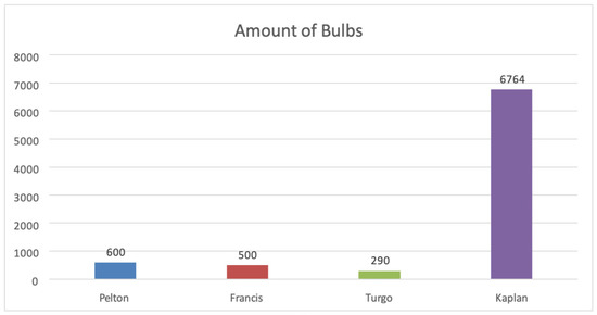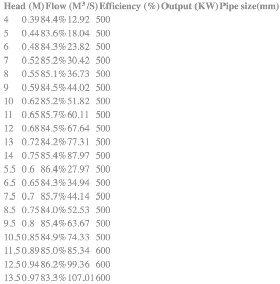 Flow rate, Q (m3/s), for each selected turbine was determined from turbine specifications provided by a particular supplier. The operation duration T (seconds) was calculated from the maximum capacity of water stored, divided by the flow rate. The efficiency of each pump was determined from the supplier’s specification table. The efficiency of the Francis, Turgo, Kaplan, and Pelton turbines was 85%, 82%, 84.5%, and 85%, respectively. Following the previous assessments, the power (P) was computed by dividing the determined potential energy with the duration of the water flow and the efficiency of the turbine. Power was presented as the number of light bulbs it can light up. The energy consumption rate of an LED light bulb used in the MLCP is assumed to be rated at 10 W. Subsequently, this power value was divided by the power consumption per individual bulb to convert power into number of bulbs. This comprehensive evaluation served as the basis for selecting the optimal turbine model capable of illuminating the greatest number of bulbs for the most extended duration, thereby ensuring the most efficient and effective power utilization. The specifications for different turbines used in this study are presented in Figure 16, Figure 17, Figure 18 and Figure 19 for the Francis, Turgo, Pelton, and Kaplan turbines.