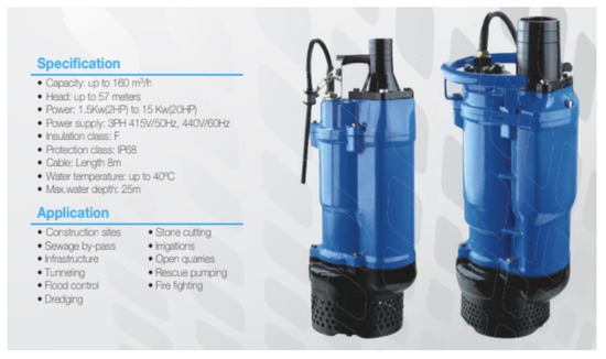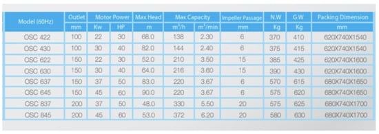- Jujico. OSC Series of Submersible Dewatering Pump. 2023. Available online: https://www.winstonengineering.com/id/en/submersible-pump/104-fujico-osc-dewatering-submersible-pump.html (accessed on 16 March 2024).