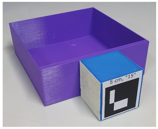 The objects required by the user are placed in containers to facilitate their detection, grasping, and delivery. These containers are designed as rectangular boxes with cubic handles, as shown in Figure 2. Its handle is specifically shaped to accommodate the gripper and is 6 cm wide to be compatible with the 8 cm gripper. In addition, the handle has an ArUco marker [] that can be recognized by the robot using computer vision. This ArUco marker encodes a number that is also useful to distinguish between the available containers.