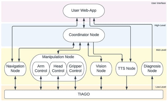 In this subsection, the software implementation we carried out is explained. Figure 3 shows the architecture of the implementation, which consists of various hierarchical nodes in a ROS Melodic framework (see http://wiki.ros.org, date accessed 14 July 2024). The mid-level nodes send commands to the controllers of the TIAGo robot, while the coordinator node directs the mid-level nodes in a way that organizes the execution of assistance routines, and finally, the web interface node is at the highest level and is responsible for receiving the request from the user and transmitting it to the routine coordinator.