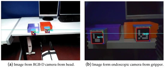- Vision node: This node scans images to identify ArUco markers and calculate their 3D positions in space.This node constantly executes a loop, scanning RGB images from both cameras (head and gripper) by using the library aruco_ros (see https://wiki.ros.org/aruco_ros, date accessed 13 August 2024), which provides real-time marker-based 3D pose estimation. However, just the corner pixels will be used. When an ArUco marker is detected, the pixel centroid is computed and published along with its number ID by ROS topic. In addition, a modified image with the centroid, ID, and bounding box is plotted for visualization, like in the example from Figure 4.Regarding markers detected with the RGB-D camera on the head, their position in space can also be determined. For this purpose, the value of the depth image corresponding to the centroid pixel is used, and the coordinates are computed using the camera’s intrinsic parameters. This information is also published via ROS topics.