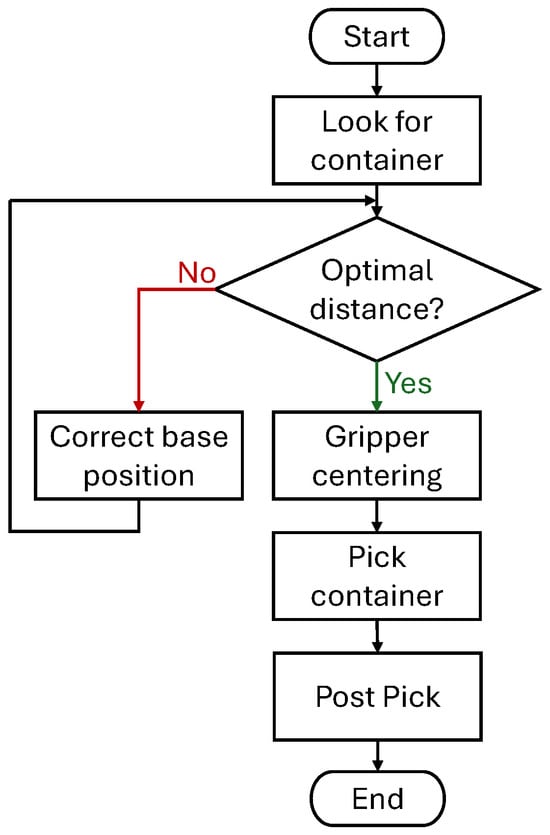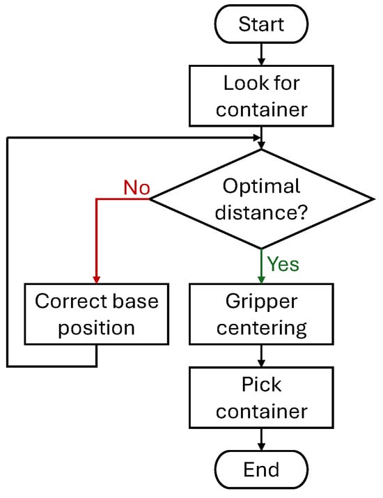 - Gripper centering: This sub-process includes a modification. First, it moves backward 0.3 m to create space for raising the gripper to an elevated position. Then, the previously presented finite state machine from Figure 8 is executed. Once the more precise location of the container is obtained, the robot moves forward 0.3 m.