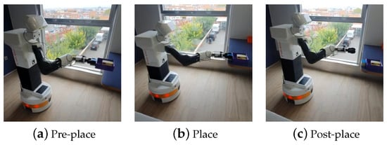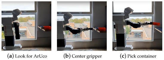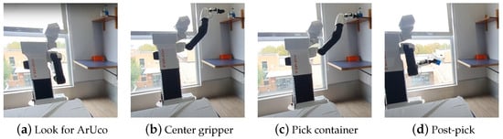 - Pick up the container: The ‘pick’ described before is executed by grabbing the container with the end-effector and then retreating from the shelf, as shown in Figure 11c.