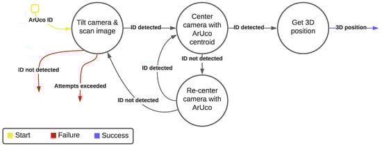 - Look for the container: The coordinator initiates the process by searching for the specified ArUco marker ID received by the user’s request. The process is represented by the finite state machine shown in Figure 7. It begins with a simultaneous tilt and scan of the camera using vision and head node services, which continue until the marker is detected. Once detected, the image is centered on the marker, and the coordinates are computed. If the marker is not found during centering, the head moves slightly to re-detect the marker, addressing any issues caused by delays or occlusions in the initial position computation.