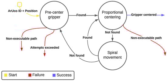 - Gripper centering: The marker position obtained may have some errors, which can cause the gripper to miss the container handle, resulting in a failed pick-up. To avoid this, the camera on the gripper is used. This process follows the finite state machine shown in Figure 8. Once the gripper is positioned in front of the marker, the end-effector moves along the Cartesian axis proportionally to the error between the detected centroid and the image center. If the marker is not detected, a spiral movement in that plane is executed to locate the marker. Once the image is centered, the pose of the end-effector provides a more accurate position of the marker in height and width. The distance to the marker is still obtained from the RGB-D camera.