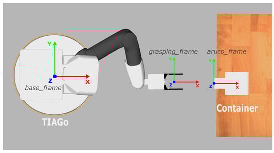 - Pick up the container: Once the pose of the container is determined, the pick-up process is executed. The goal in this step is to achieve the grasping position shown in the scheme of Figure 9. This involves moving the end-effector in front of the container handle with the gripper open. The end-effector then approaches the grasping frame to the determined ArUco position and closes the gripper. After securing the handle, the end-effector is elevated and retracted to a distance of 0.6 m from the base. The pick-up process concludes by moving the base backward 0.2 m.
