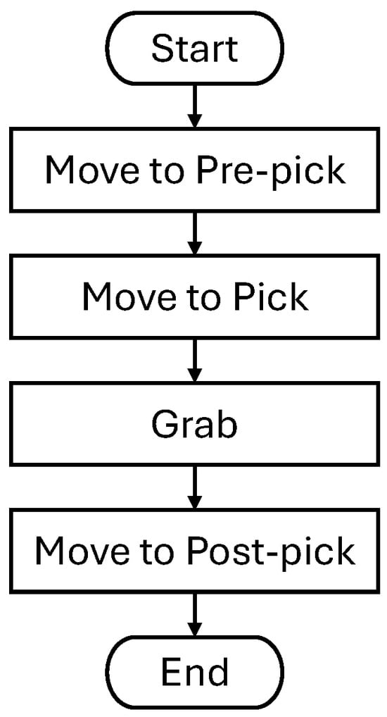 This routine consists of detecting and picking up a requested container placed on a table. This process is illustrated in the flowchart shown in Figure 5 and in the sequence of frames shown in Figure 6. It is supposed to start with the robot positioned in front of the table where the container is located, and the execution steps are as follows:
