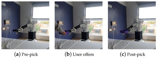 This routine facilitates the picking of a container being offered by the user. The process starts with the robot in front of the user’s location and follows the following sequence, represented in Figure 12 and illustrated in the sequence in Figure 13: