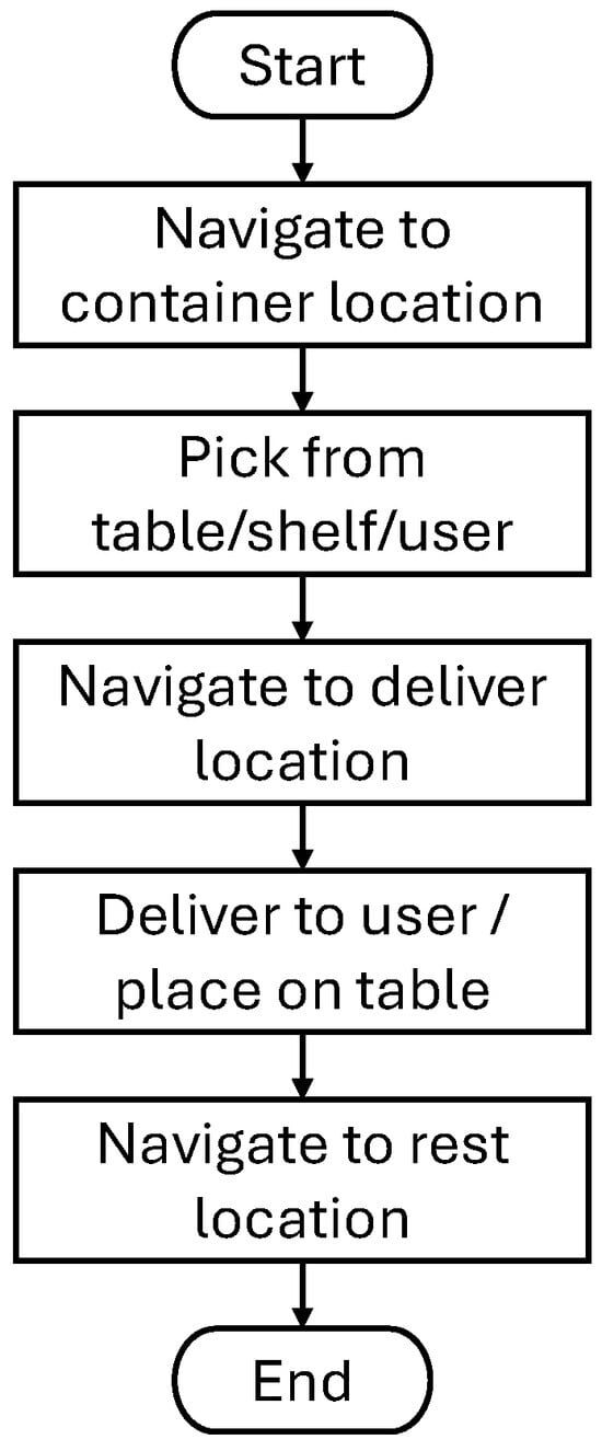 Flowchart of the implemented assistive delivery routine: this routine consists of navigating to the container’s location, picking it up, and delivering it to the user or table.