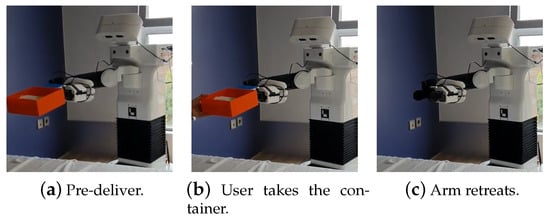 - Deliver container: If the delivery point is a table, the robot performs the previously described routine of placing the container. If the delivery point is to the user, the process is illustrated in Figure 17 and is as follows: The routine begins by moving the end-effector forward to the user. The robot then notifies the user of the action it will perform (either holding or dropping the container). It executes the action by either maintaining its grip or opening the gripper to release the container. After a brief wait, the end-effector is retracted to a distance of 0.6 m. If the action involves dropping the container, the arm is then commanded to return to its home position.