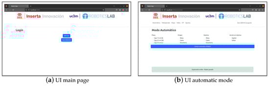 For the user interface (UI), a react-based web application (see https://es.react.dev/, date accessed 10 June 2024) was created. When this application is launched, it is served in a local port and IP of the robot’s network. Therefore, this UI can be utilized in any device connected to the TIAGo network by accessing this direction, e.g., the personal phone belonging to the user. In another respect, rospylib (see https://roslibpy.readthedocs.io/en/latest/, date accessed 14 July 2024) is used for interfacing with TIAGo ROS software (distro Ferrum, Ubuntu 18.04 LTS and ROS Melodic LTS), whereby the commands transmitted to the robot by the app are conveyed via ROS topics and services.