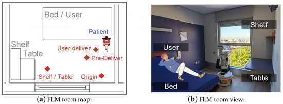 Experiments were conducted in a common room of the FLM with the set-up presented in Figure 20. The room is equipped with a table, a shelf, and a bed for testing each delivery routine. The assistance task was pre-configured for this environment by mapping the room and storing the POIs. Each participant was introduced to the same robot and set up to ensure consistency. During the demo execution, the patient was placed in his own wheelchair next to the bed to simulate being in bed.