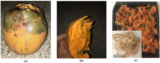 (a) Whole Borassus fruit, (b) sliced Borassus fruit, and (c) wet and oven-dried Borassus fruit fiber.