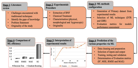 A primary dataset was created from the experimental results. Gradient Boosting Regressor (GBR) and Decision Tree Regression (DTR) models were used to predict the hygroscopic properties of the natural fibers based on the created primary dataset. Both models (GBR and DTR) were analyzed comparatively to determine the most efficient model during the prediction.