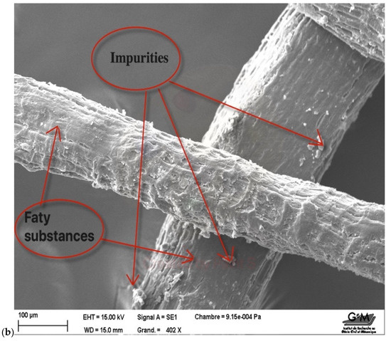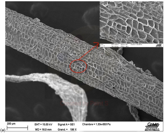 From the diameter- and length-distribution examination, it was observed that the natural fiber diameter was uniform throughout the length, hence the average was considered (Figure 3a). The average values of the diameter distribution indicated that most fibers existed around 150 µm ± 5, whereas the length distribution showed that the average values of fiber length were 15 cm ± 5. The natural fibers exhibited a multi-cellular structure with a very porous surface. Additionally, to the surface pores, the fibers contained some impurities, as seen in Figure 3b. By performing the alkaline treatment on the fibers, an increase in the fiber’s volume and swelling was observed. The swelling resulted in a more uniform diameter along the length and a smoother fiber surface. This can be explained by the removal of cellulosic material contained in the BNF by the sodium hydroxide (NaOH) solution [53]. The treatment of the BNF by the sodium hydroxide (NaOH) solution removes hemicellulose and lignin primarily compared to other components like waxes and pectins.