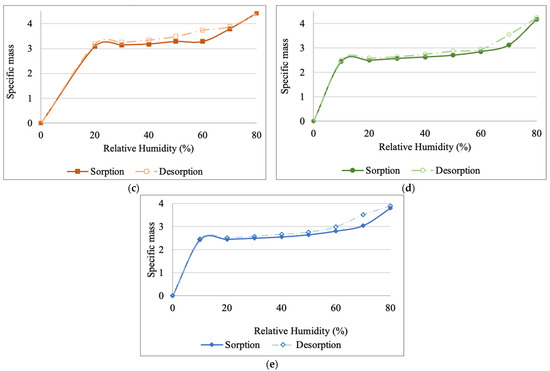 Sorption and desorption behavior of: (a) untreated, (b) treated after 1 h, (c) treated after 24 h, (d) treated after 48 h, and (e) treated after 72 h.