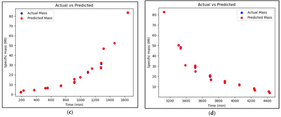 Prediction vs. experimental using DTR for: (a) sorption level in the BNF, (b) desorption level in the BNF. Prediction vs. experimental using GBR for: (c) sorption level in the BNF, (d) desorption level in the BNF.